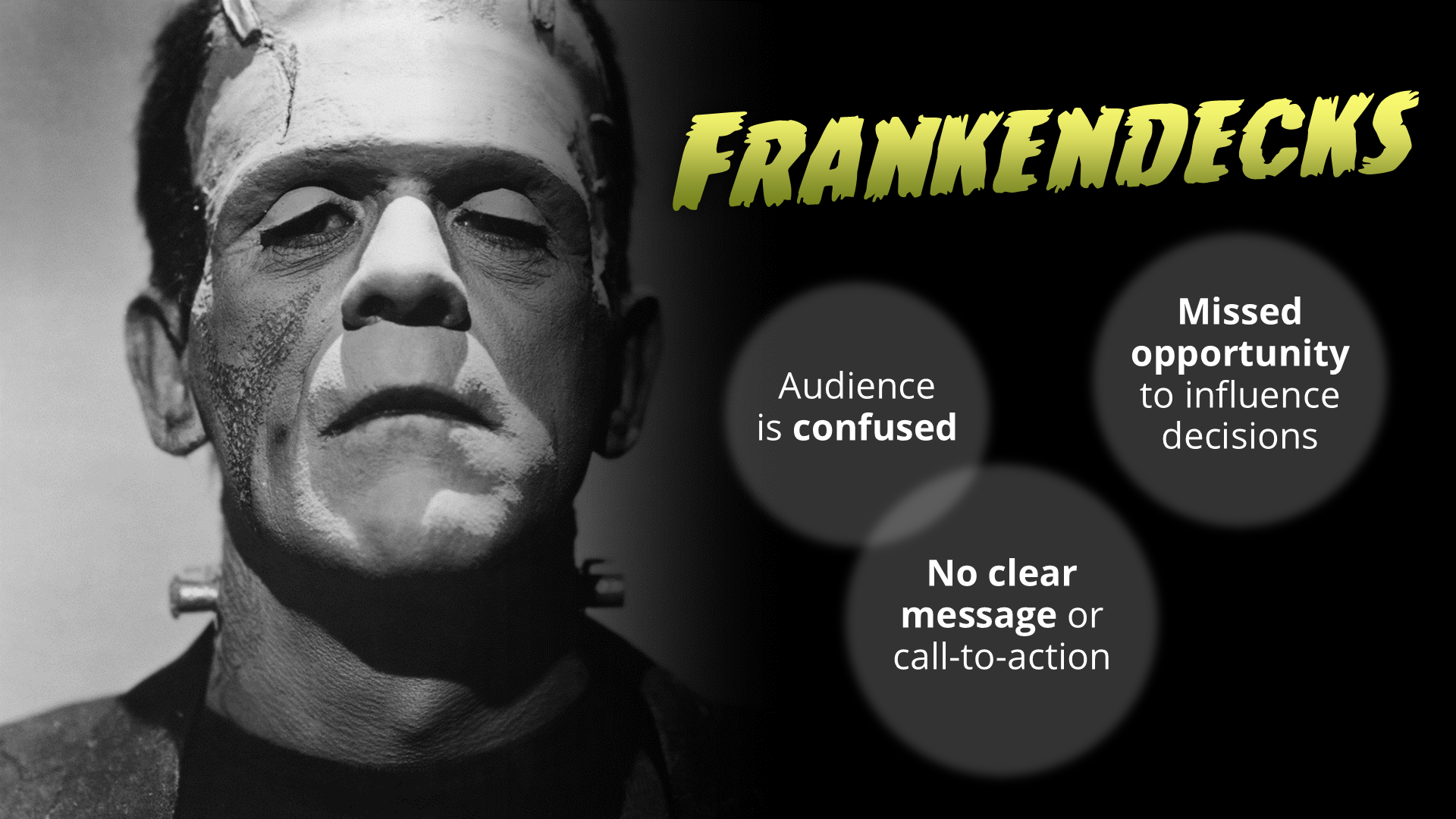 Don’t feel bad. We ALL try to save time by leveraging other people’s slides, but few of us actually improve our presentation when we do it. Instead we create the…*eeeeek!* ”Frankendeck.”
