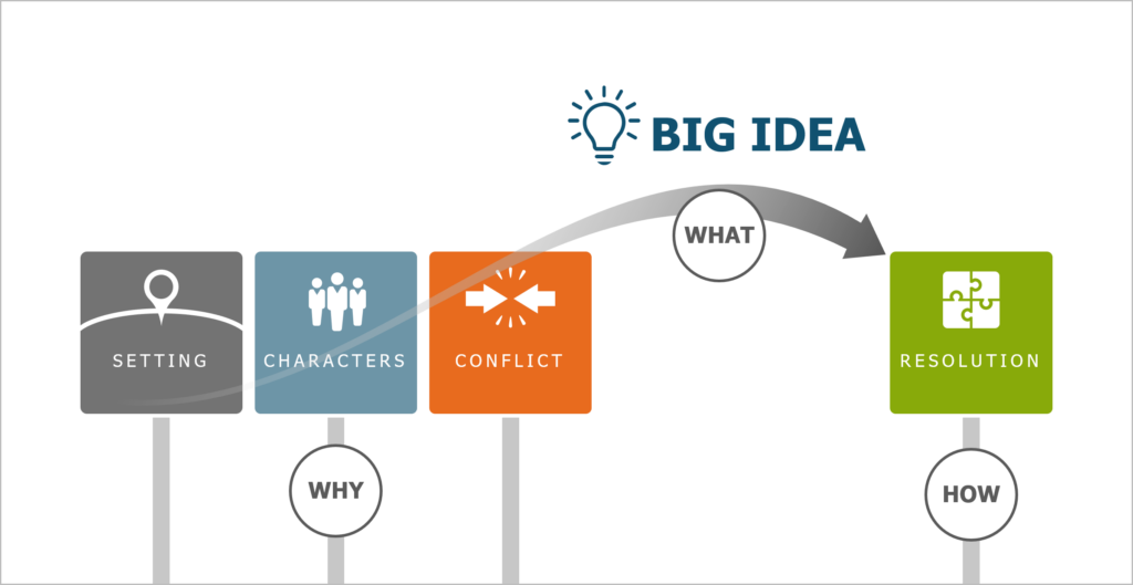 The How: The fourth signpost of storytelling is your resolution: How you are going to implement your ideas? For engineers, it might be details on timing and resources for a new product. For salespeople, it might be the unveiling of new pricing options. For CEOs, it might be revenue forecasts presented to the board. The resolution is how your big idea will come to life.