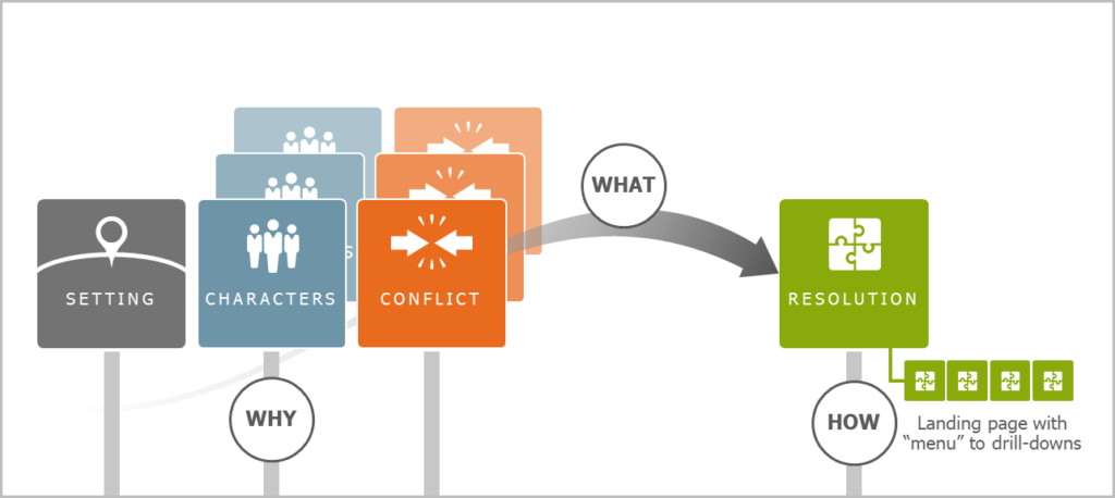 After you’ve introduced setting, multiple characters and conflict(s), you must “resolve” the issues. Building a resolution “landing page” is an excellent way to guide your conversation and show your audience where you are prepared to go. This visual map drills down to more detail on each conflict, arranged as subtopics. It allows you to respond to your audience in the moment by easily navigating to areas of interest. When your audience has a visual representation of what you are prepared to discuss, it invites conversation and lets you dig in and address their specific needs. It’s as easy as clicking back to your home base and drilling down into another area.